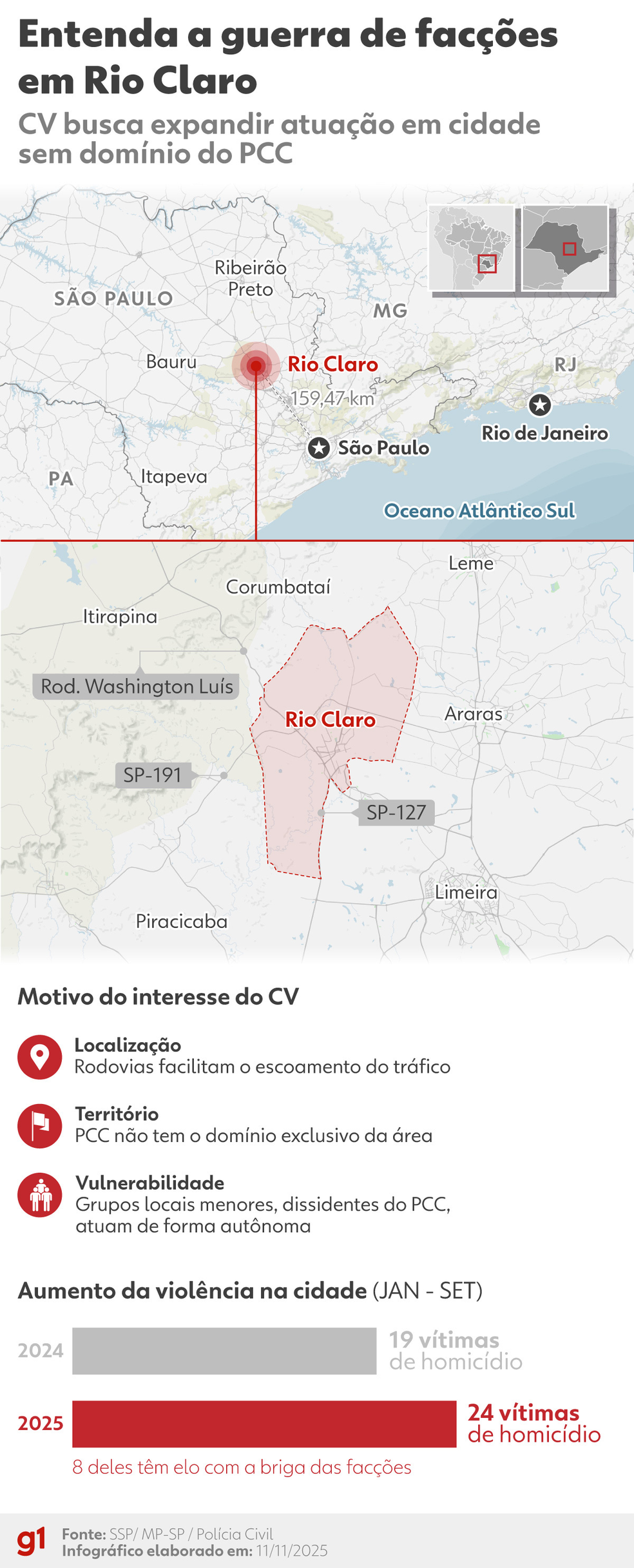 O g1 teve acesso a relatório de inteligência da Polícia Militar apontando que a rivalidade entre o PCC e o CV impulsionou parte da violência em Rio Claro.