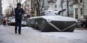 Uma pessoa caminha ao lado de um veículo blindado russo capturado em meio à invasão russa da Ucrânia. — Foto: HENRY NICHOLLS/AFP